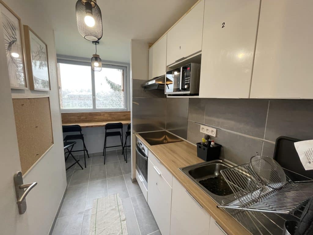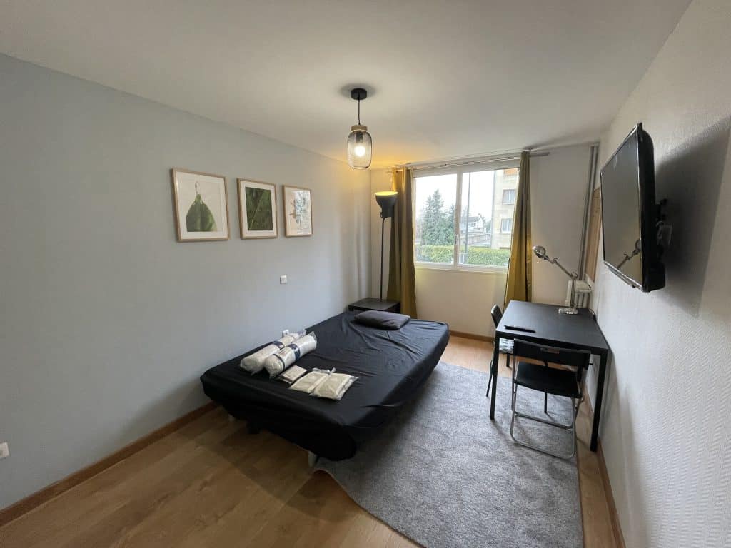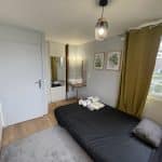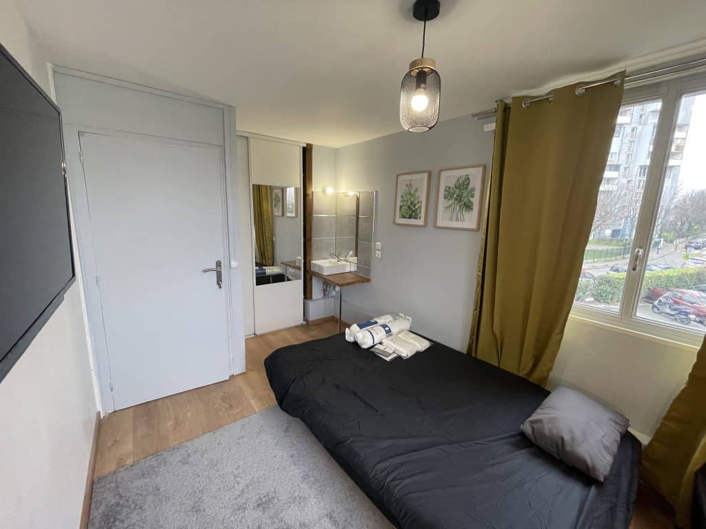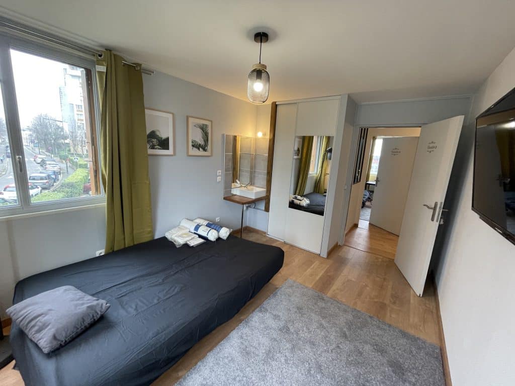 Villetaneuse – Route de Saint-Leu – Bel appartement de 82m² entièrement refait à neuf qui offre une cuisine aménagée et équipée, deux salles d’eau, deux Wc et quatre chambres équipées avec un canapé lit neuf, un bureau, une table basse, des lampes, une grande télévision et des rangements.